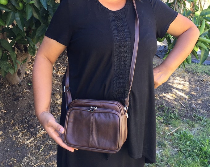 Leather brown crossbody purse bag boxy, 3 zippered roomy compartments, adjustable strap